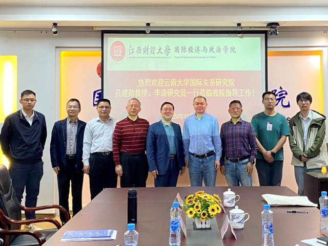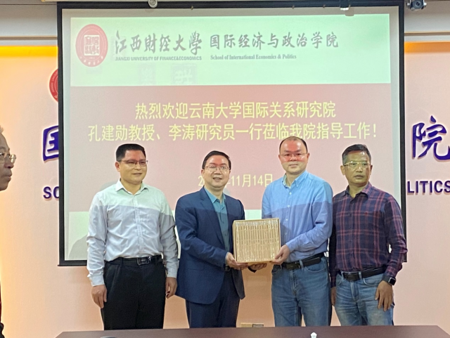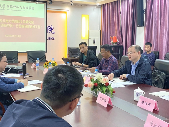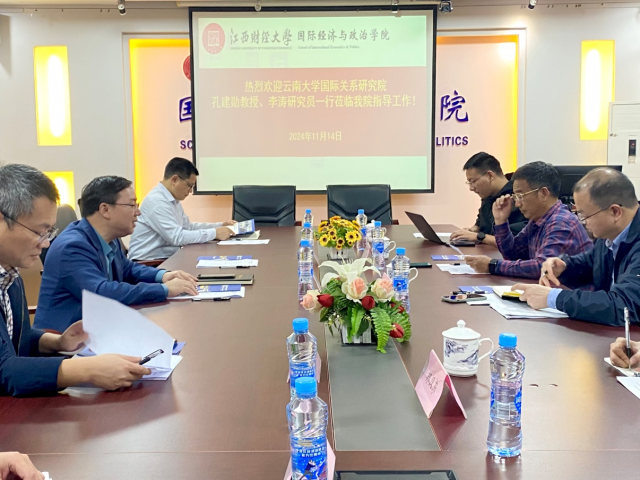 11月14日上午,云南大学国际关系研究院孔建勋教授、李涛研究员一行4人到访成人娱乐 进行调研交流,成人娱乐 吴朝阳院长、许统生教授、刘兴华教授、余昌龙副院长以及周正清博士参与座谈。