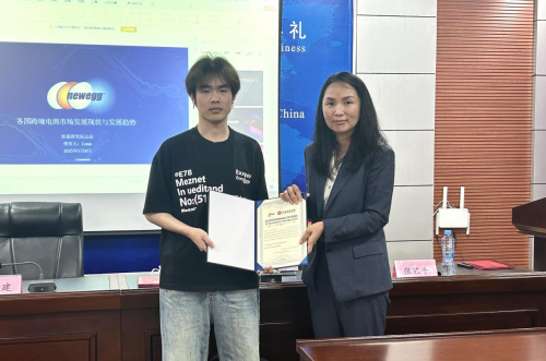 揭牌仪式后,路娜总经理以“全球跨境电商市场新机遇与挑战”为主题,详细介绍了集训课程安排。课程将采用“理论授课+项目实战+专家指导”的模式,围绕跨境电商运营具体操作的核心模块设置课程体系,邀请相应板块的企业精英人才进行授课。值得一提的是,在课程介绍间隙,路娜总经理亲自为优秀实习代表朱乐乐同学颁发优秀实习证明,并奖励1000元奖金。朱同学在新蛋集团实习期间,主导的亚马逊店铺优化项目使店铺月销售额提升40%,其出色表现得到企业高度认可。