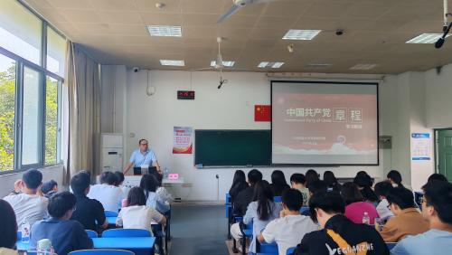 徐翔以“《中国共产党章程》学习解读”为主题讲授了党课,围绕概述、发展历程、总纲、条文、学习和遵守党章五个方面详细解读了《中国共产党章程》,对总纲中所蕴含的党的性质、指导思想、基本路线、重大方针政策等核心内容进行了深入剖析,全面解读了具体条文,并结合生动的案例和视频强调了发展党员的标准和党员的义务。徐翔勉励全体学员要自觉学习党章、遵守党章、贯彻党章、维护党章,将党章要求内化于心、外化于行,在日常学习、工作和生活中发挥先锋模范作用。